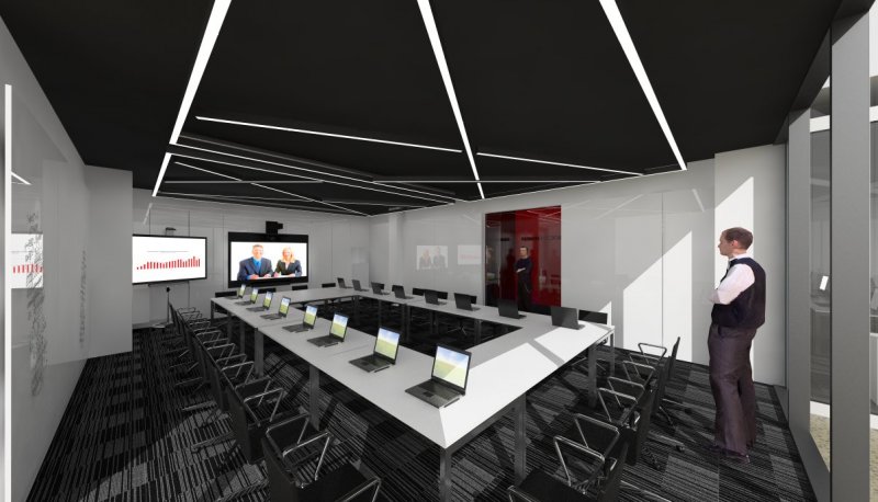 Návrh interiéru a dispozičního řešení multimediální zasedací místnosti a kanceláře Human Factor Studia v administrativní budově fy Honeywell v Brně.